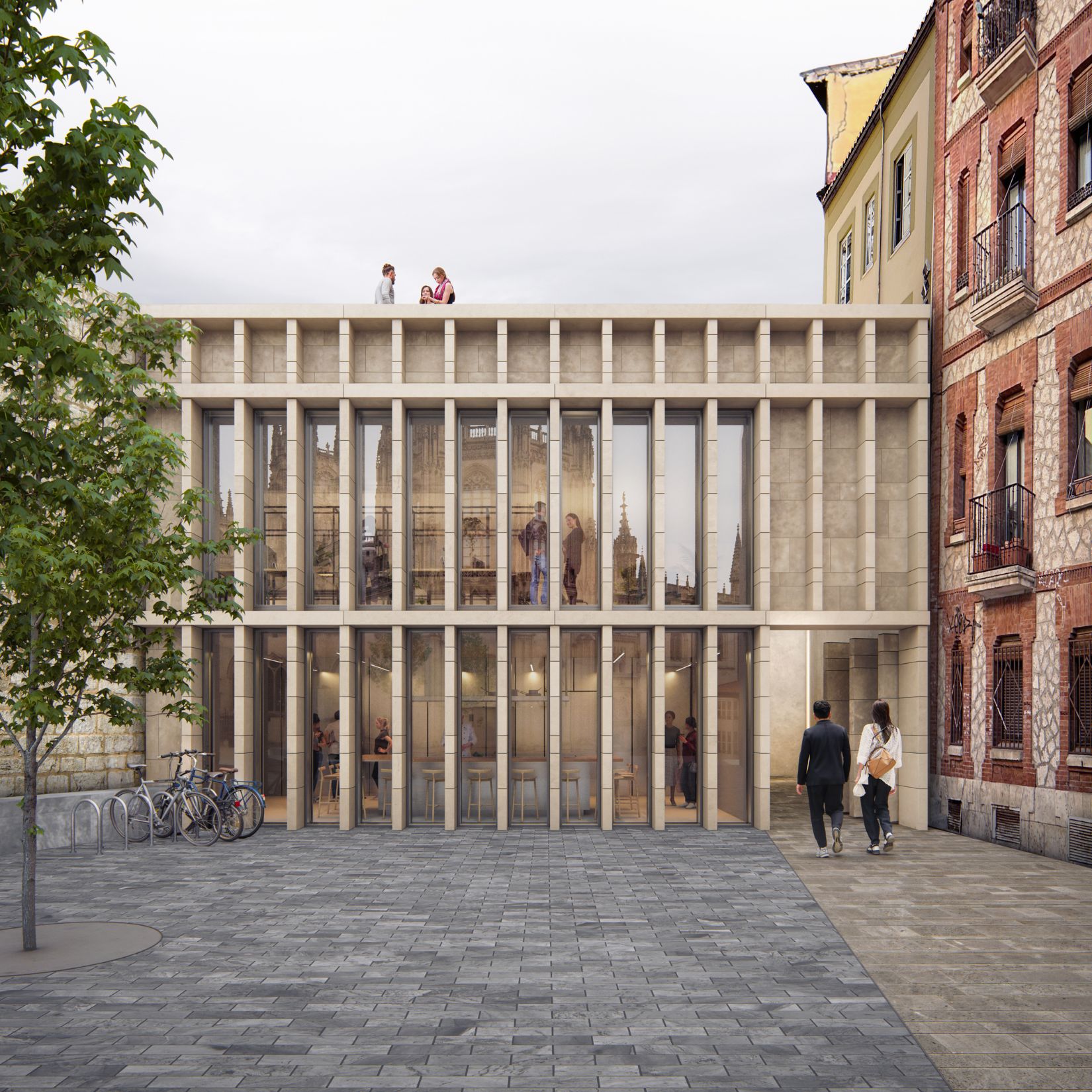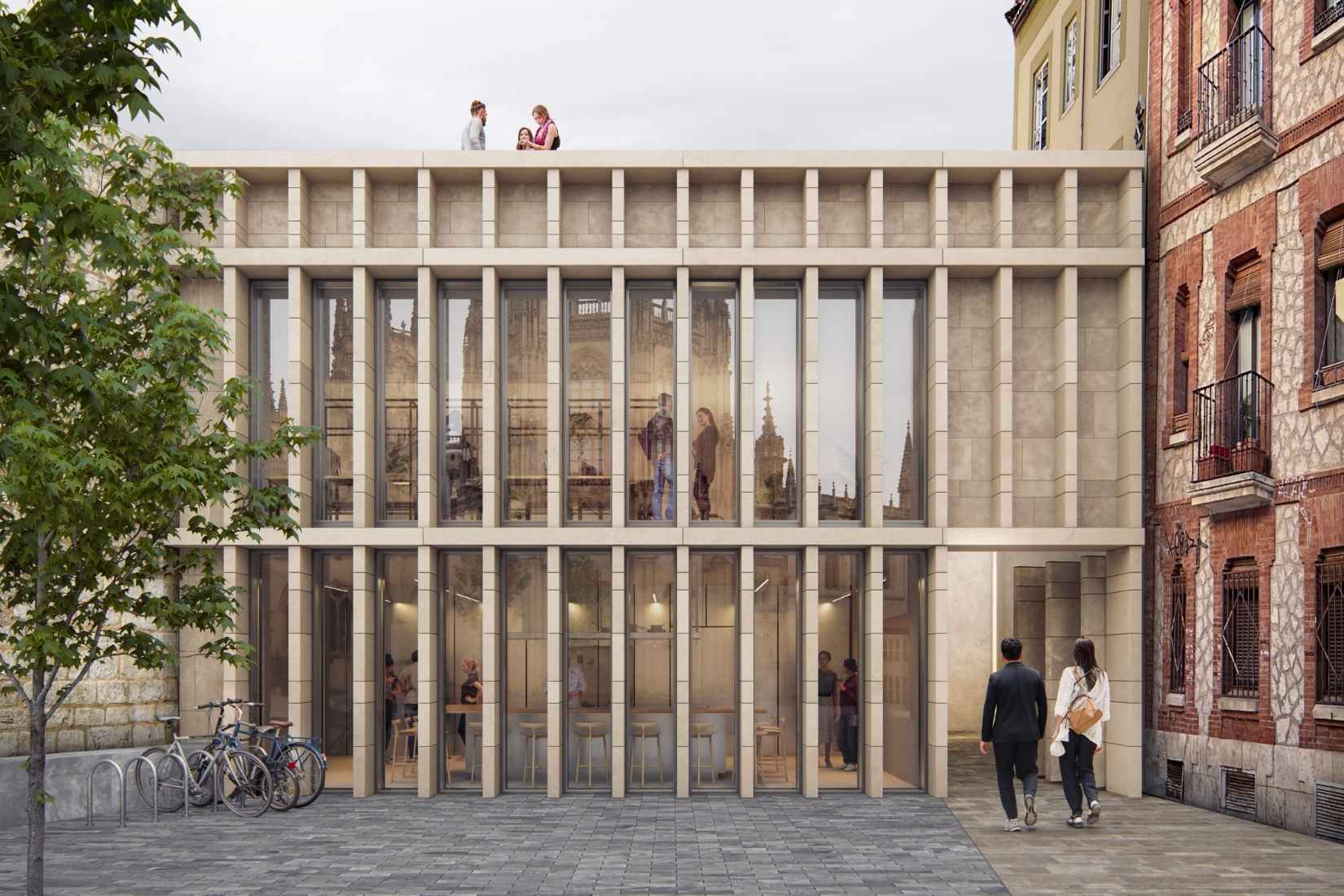 La intervención repliega el plano opaco de la fachada hacia el interior, liberando la luz y creando una envolvente permeable que amplía la conexión entre el edificio y su entorno. La luz entra profundamente en el espacio, iluminando incluso las zonas más limitadas por la orientación y el entorno construido. Frente a la catedral, una celosía de piedra protege el vidrio y, al mismo tiempo, oculta y revela, simulando un muro continuo que respeta la monumentalidad del entorno y funde arquitectura contemporánea con la memoria histórica.