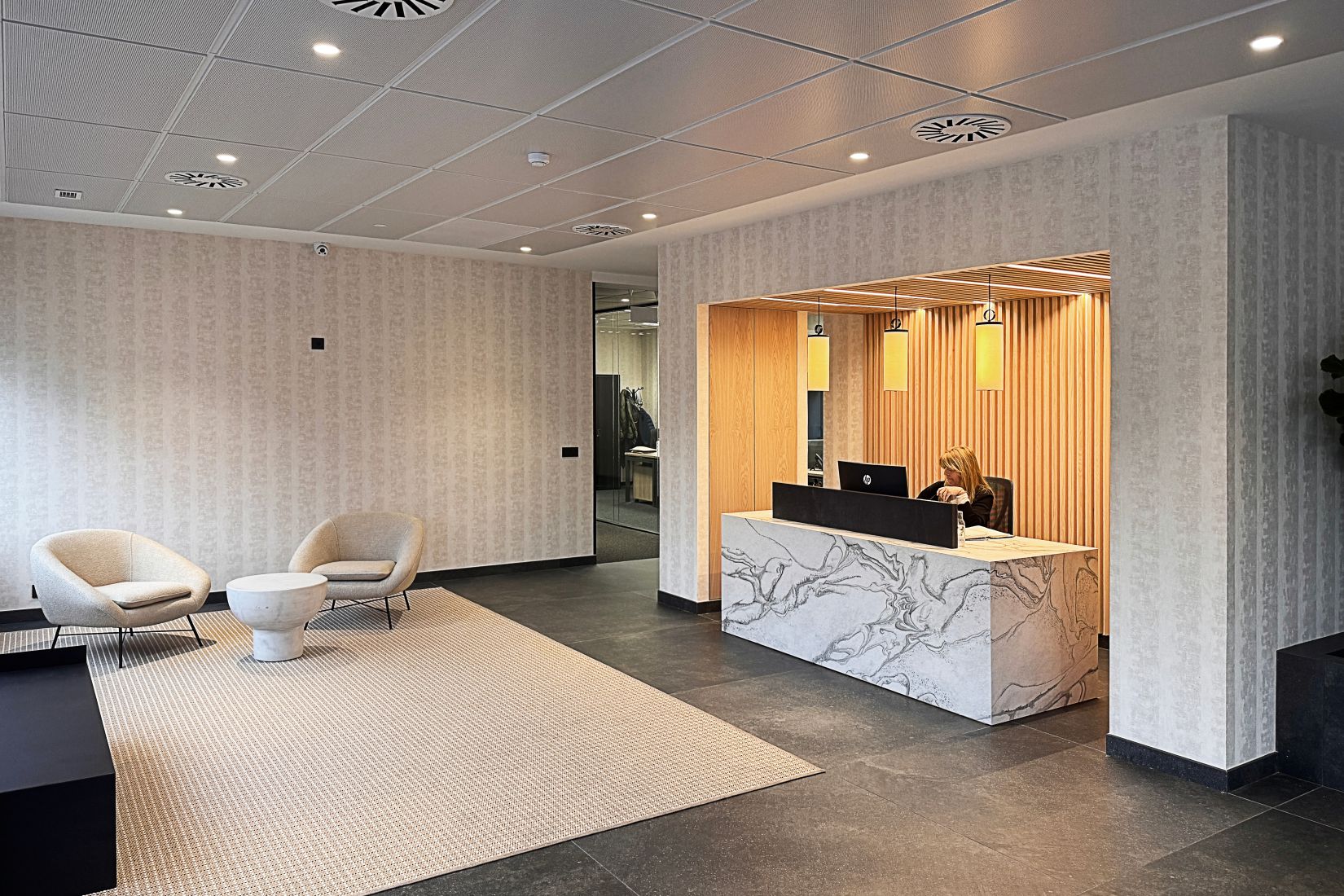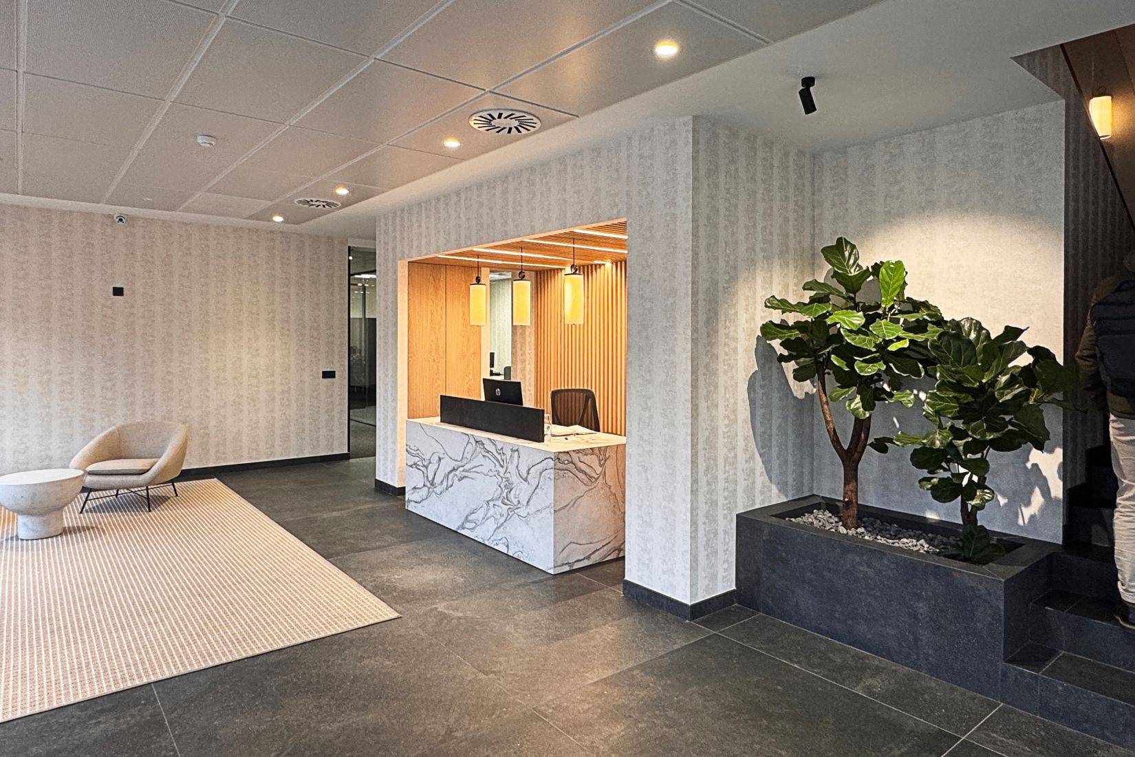 El acondicionamiento se lleva a cabo en las tres plantas en las que se reparten los distintos espacios de las oficinas. En planta baja se produce la mayor parte de las modificaciones, adecuándose la recepción y la sala de recepción de visitas, redistribuyendo los aseos así como los distintos despachos.